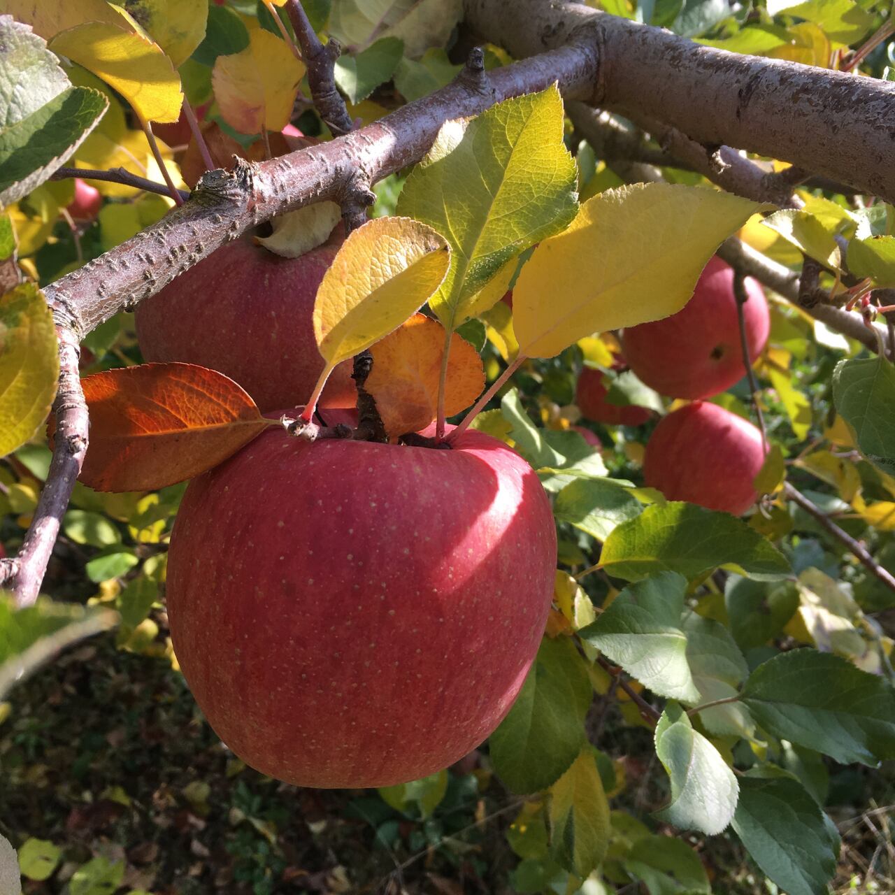 葉とらず栽培のりんごは見た目の赤さにばらつきは出てしまいますが、葉摘をしないことでより多くの太陽の光をとりこみ、光合成で甘みの元をたくさん作ります。